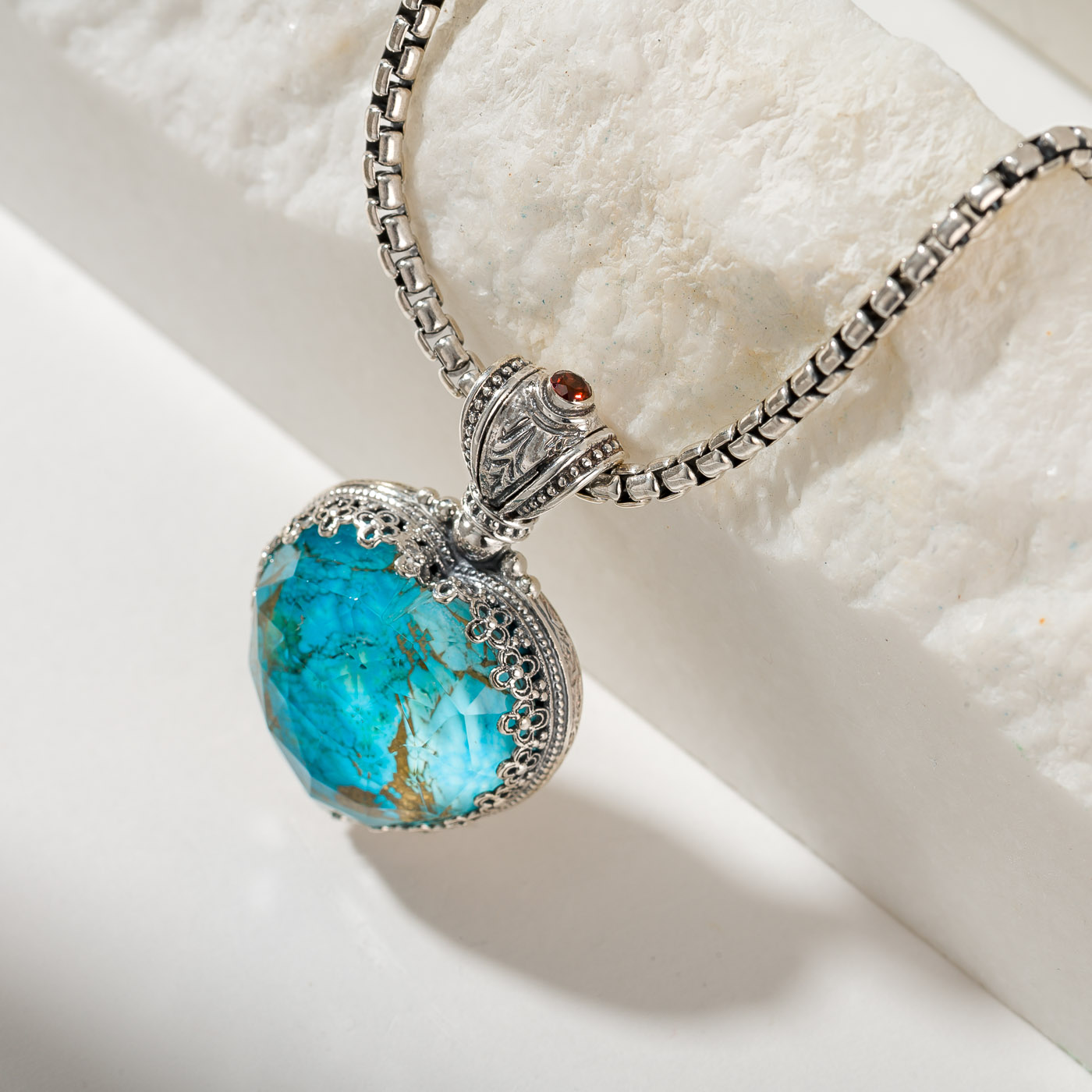 Pendant in sterling silver with doublet stone 20mm and a tiny garnet in the top.