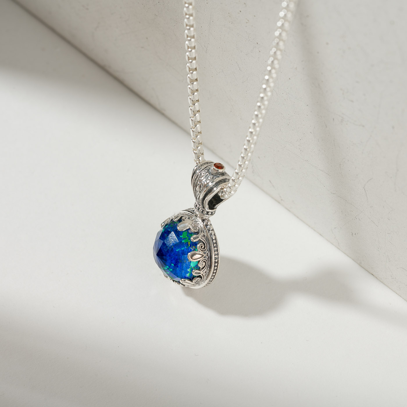 Pendant in sterling silver with doublet stone 12mm and a tiny garnet in the top.