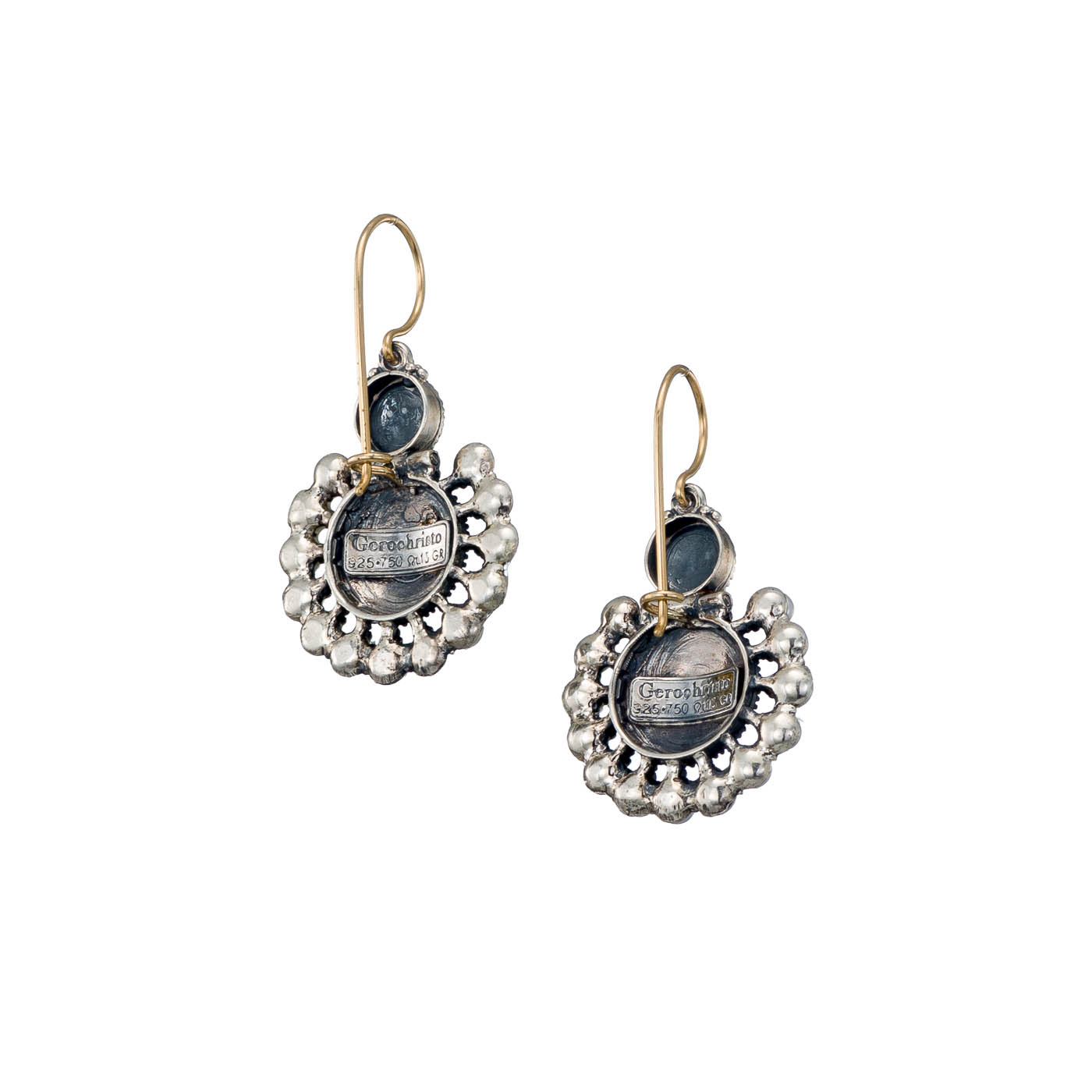 Earrings in 18K solid Yellow Gold, sterling silver, semi precious stones 5mm and freshwater pearls.