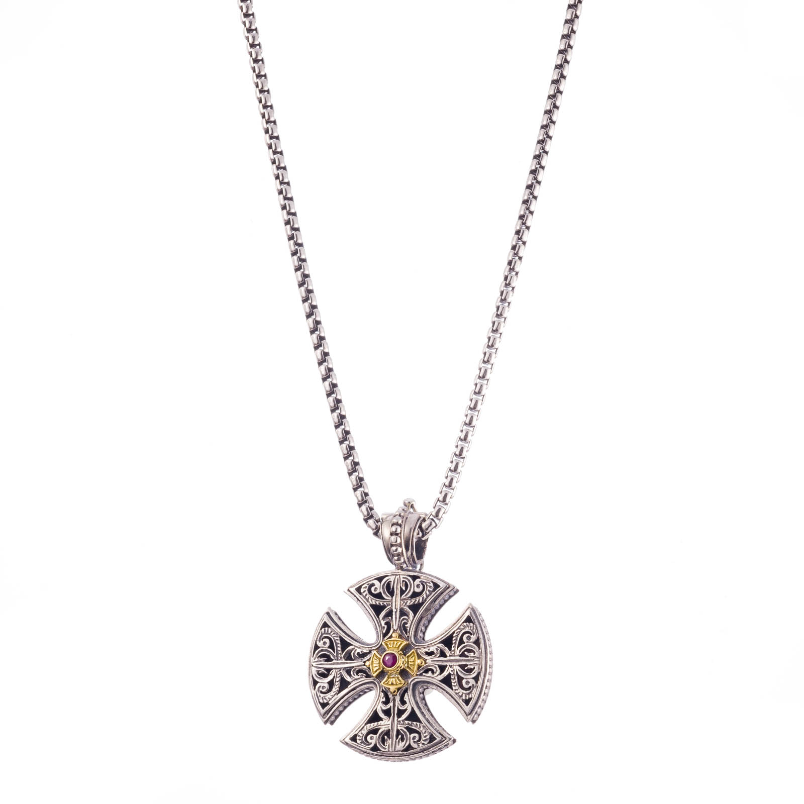 Cross in 18K solid Yellow Gold and sterling silver with ruby.