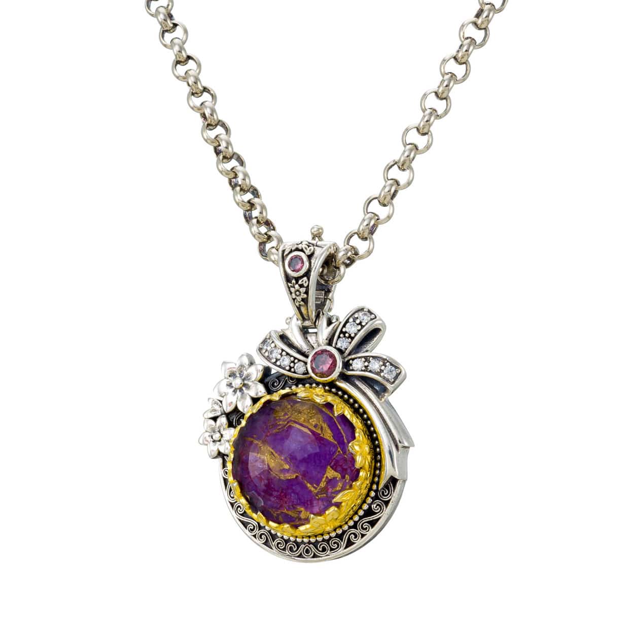 Pendant in sterling silver with gold plated parts, zircons and doublet stone 20mm round.