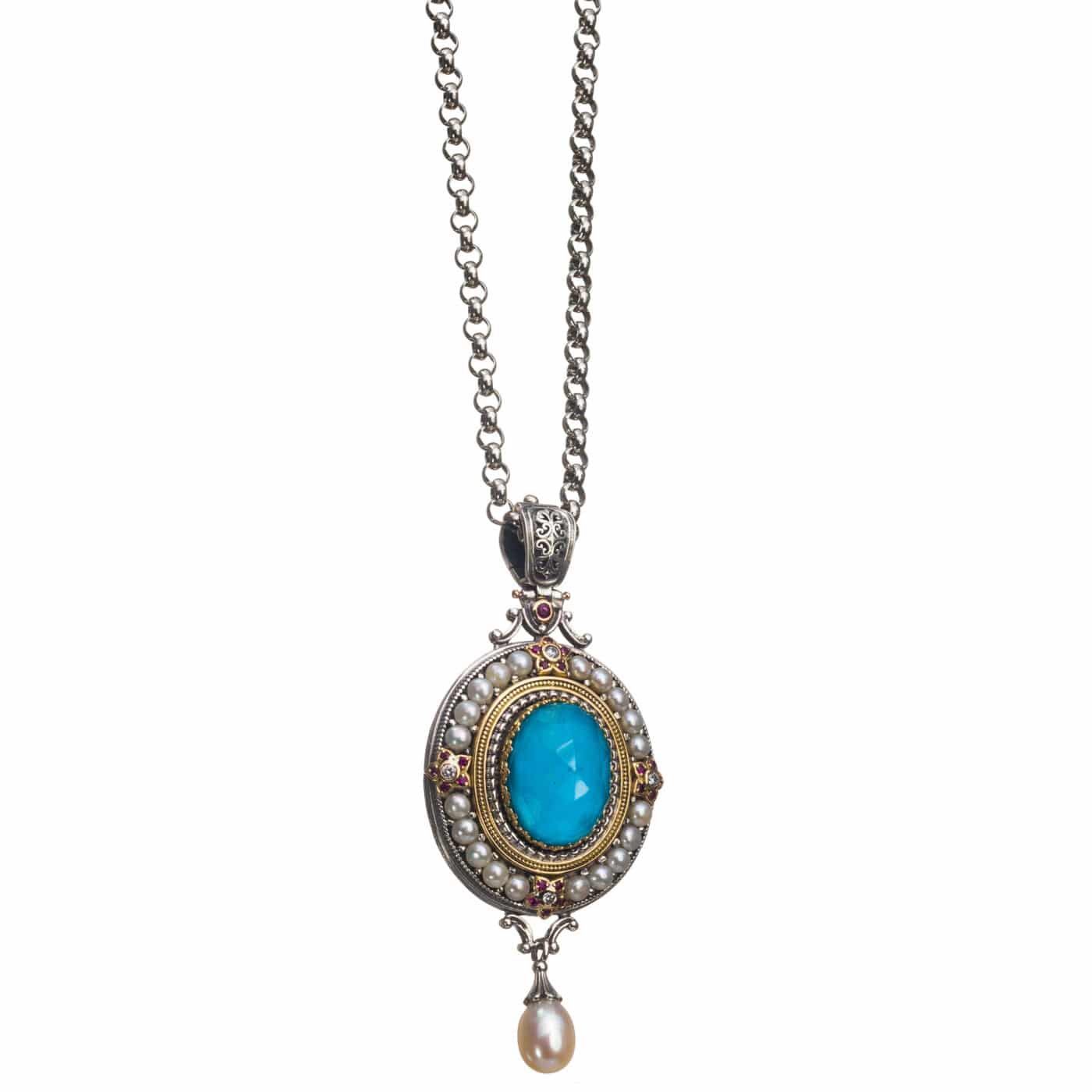Pendant in 18K solid Yellow Gold, sterling silver, rubies, diamonds, freshwater pearls and doublet stone 15x20mm oval.