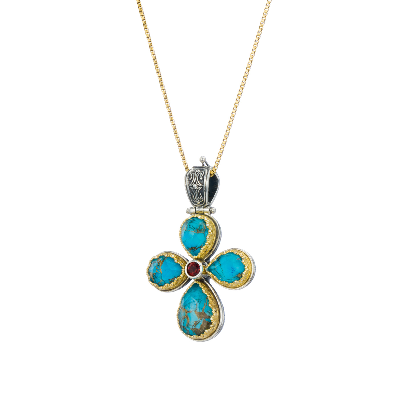 Cross in sterling silver with Gold plated parts, garnet and doublet gemstones.