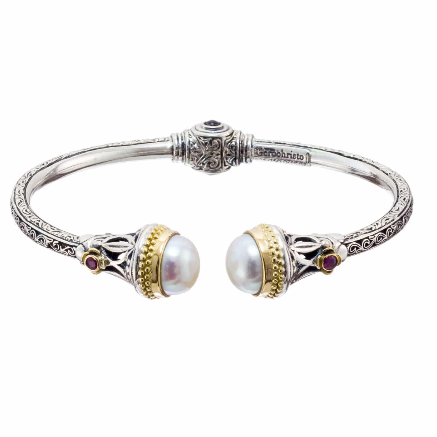 Bracelet and Ring in 18K solid Yellow Gold and Sterling Silver with freshwater pearls and rubies.