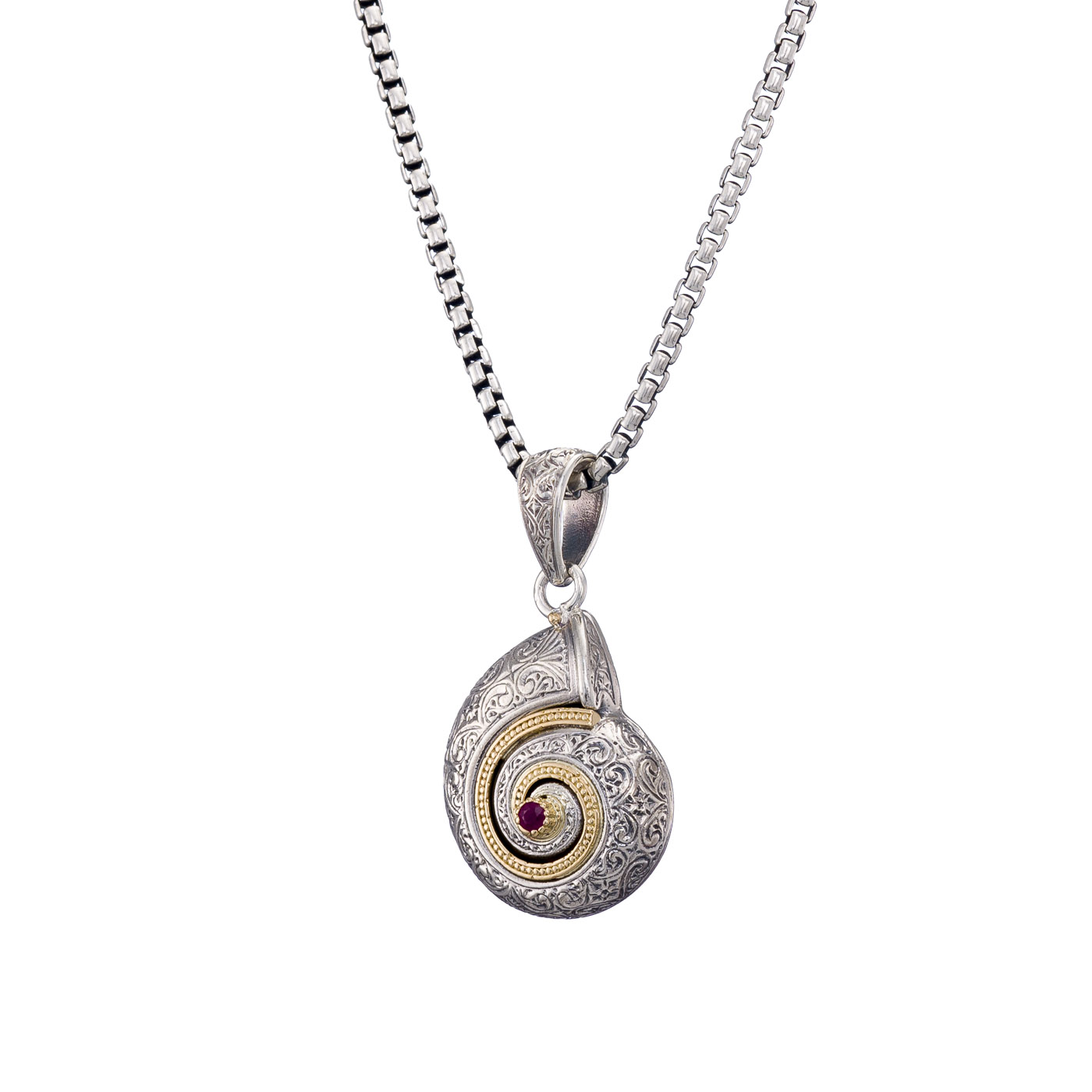 Home / Shop / Women's / Sea Snail Pendant in 18K Gold and Sterling Silver with Ruby